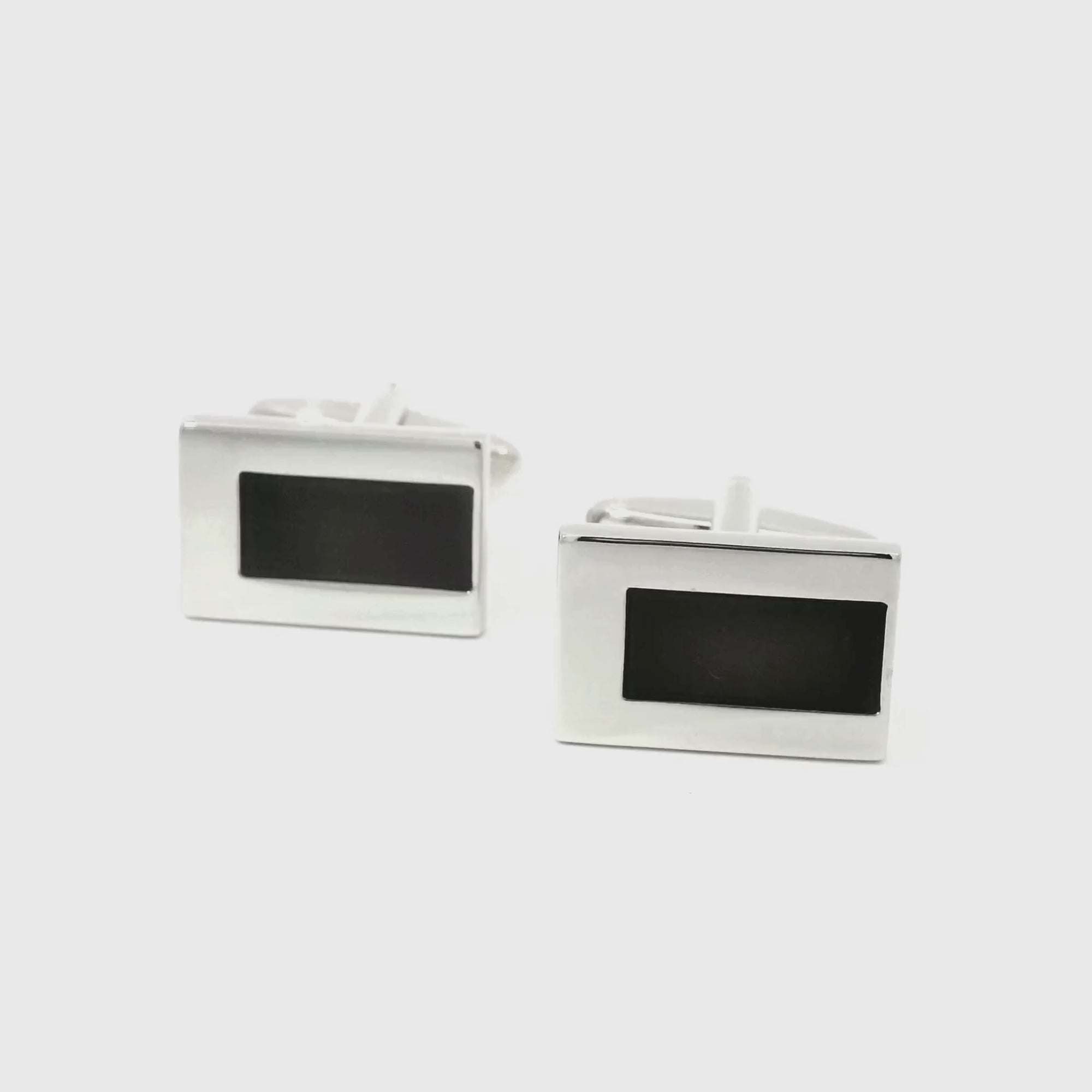 A masterpiece of sophistication and style. Crafted with precision and attention to detail, these cufflinks feature a sleek combination of a silver finish and a black enamel offset set in silver bullet backing. Designed in a classic rectangle shape, these cufflinks effortlessly blend modern aesthetics with traditional charm, making them the perfect accessory for any formal occasion.