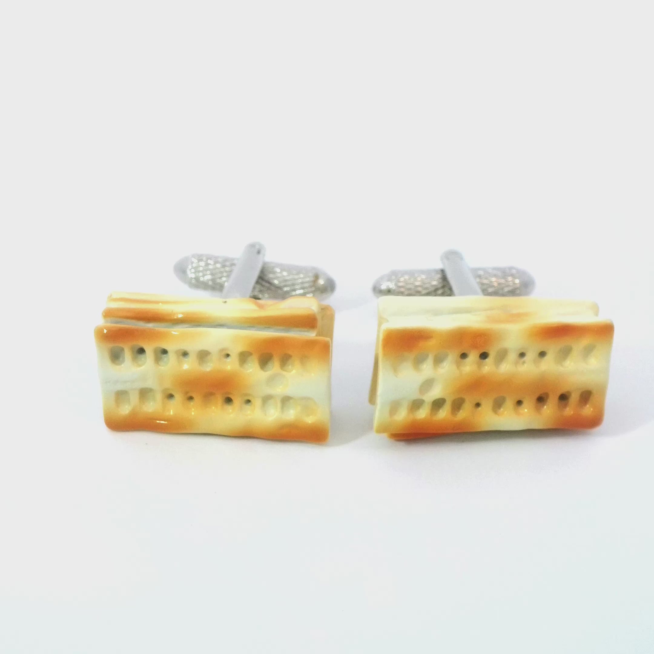 Introducing our Crackers Cufflinks, a delightful and festive addition to your accessory collection. These cufflinks feature miniature replicas of crackers in a yellow enamel finish, almost replicating a golden brown and crispy finish!