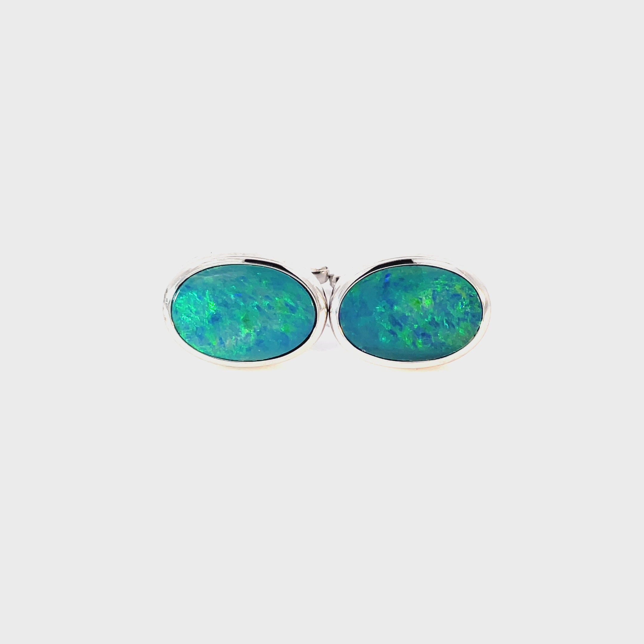 These sterling silver doublet Natural Opal cufflinks are a testament to the timeless beauty of natural Australian opals. These opals are mined in Lightning Ridge in New South Wales, Australia. A doublet opal is a layer of Australian light opal backed onto natural stone. This pair has been carefully matched for similar colours and cut to a uniform size. Size 20 x 15mm, set in 925 Sterling Silver.
