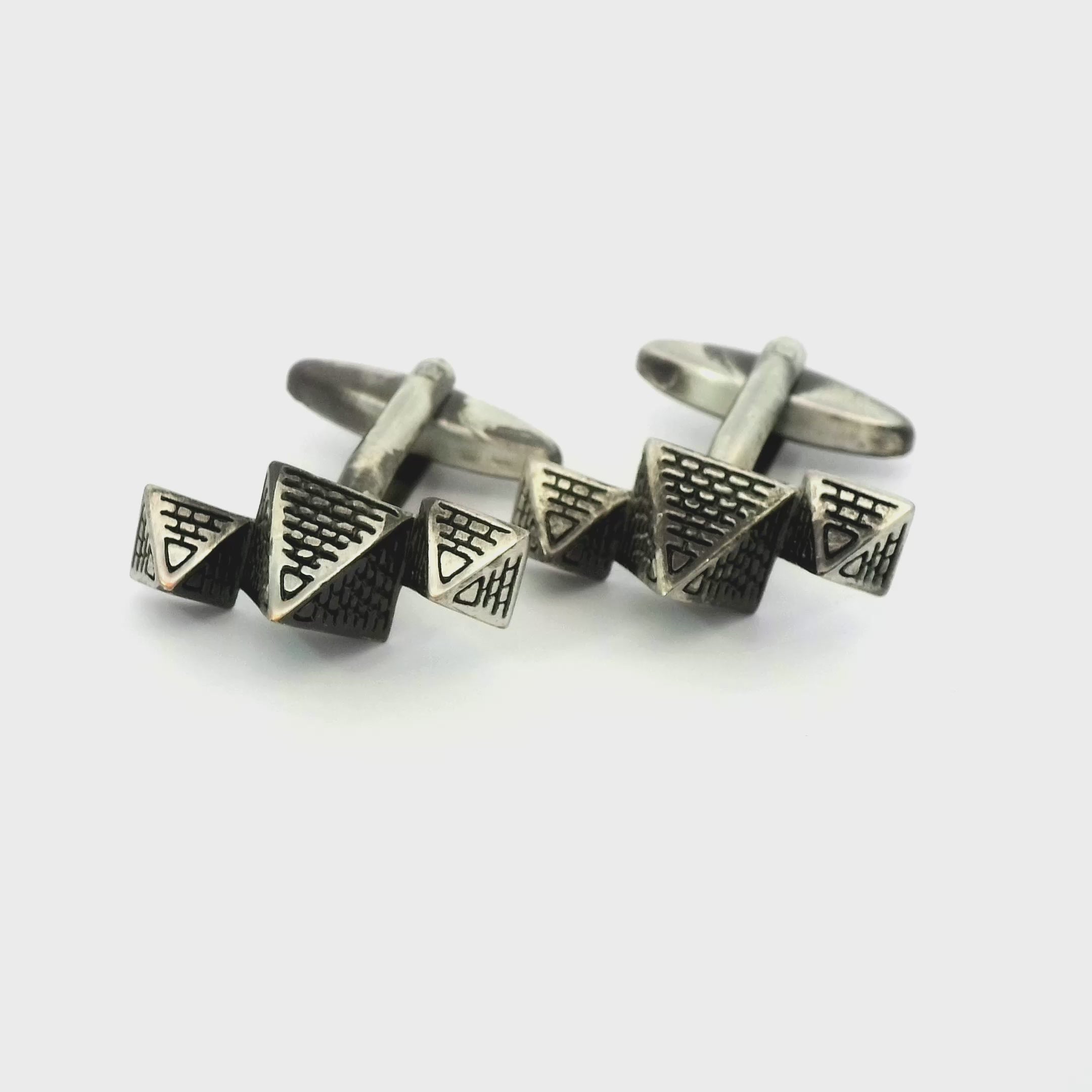Introducing our Egyptian Pyramids Cufflinks, a captivating homage to ancient wonders and timeless elegance. These cufflinks feature 3 miniature replicas of the iconic Egyptian pyramids, intricately designed with an antique finish. Each cufflink transports you to the mysterious world of ancient Egypt, where pharaohs ruled and marvels were built.