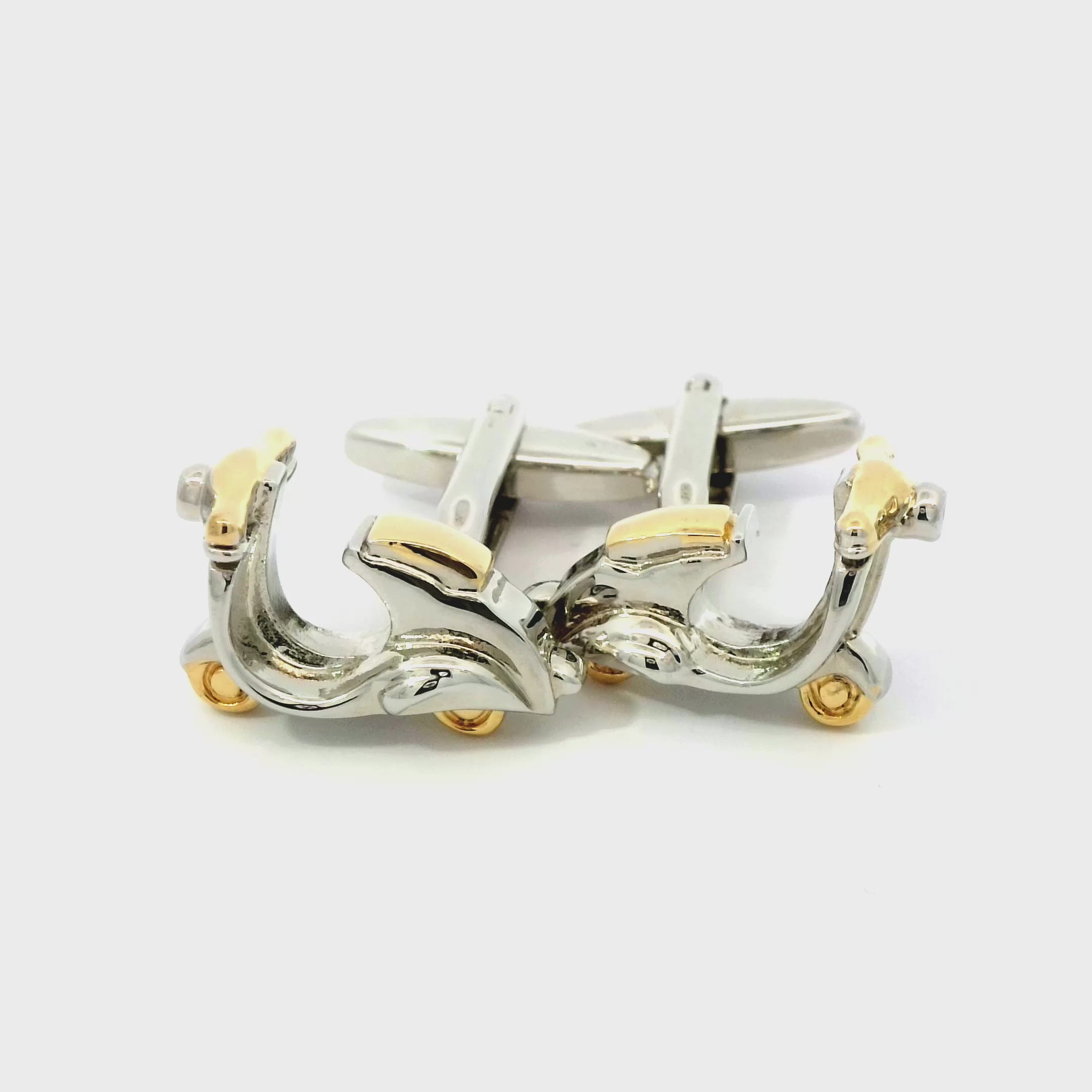 A charming 3D scooter design in gold and silver adds a unique touch to any outfit. Featuring gold detailing on the handlebars, seats and wheels. Finished in shiny polished rhodium plating. Perfect for any occasion, elevate your style effortlessly.