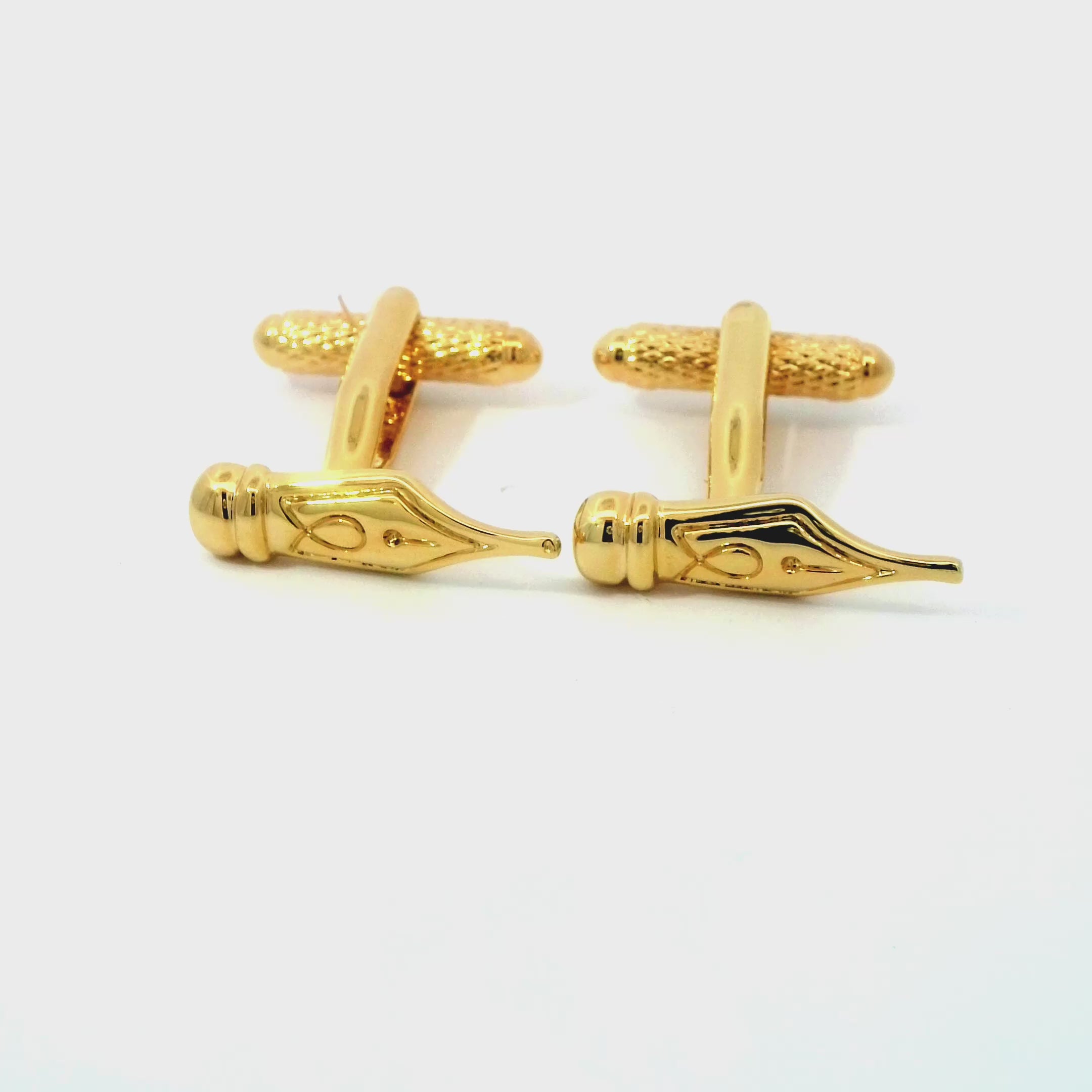 These elegant cufflinks feature a classic fountain nib pen design in gleaming gold, perfect for adding a touch of sophistication to any outfit. Finished in shiny rhodium that resists tarnishing and wear.