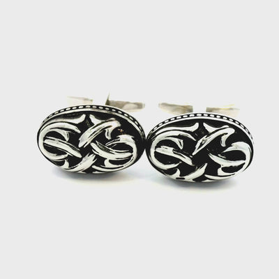 Embrace dark elegance with these Manfred Gothic Style Cufflinks, crafted in silver with striking black enamel details. Inspired by gothic artistry and timeless sophistication, these cufflinks exude a bold and mysterious charm. Finished in shiny rhodium plating.