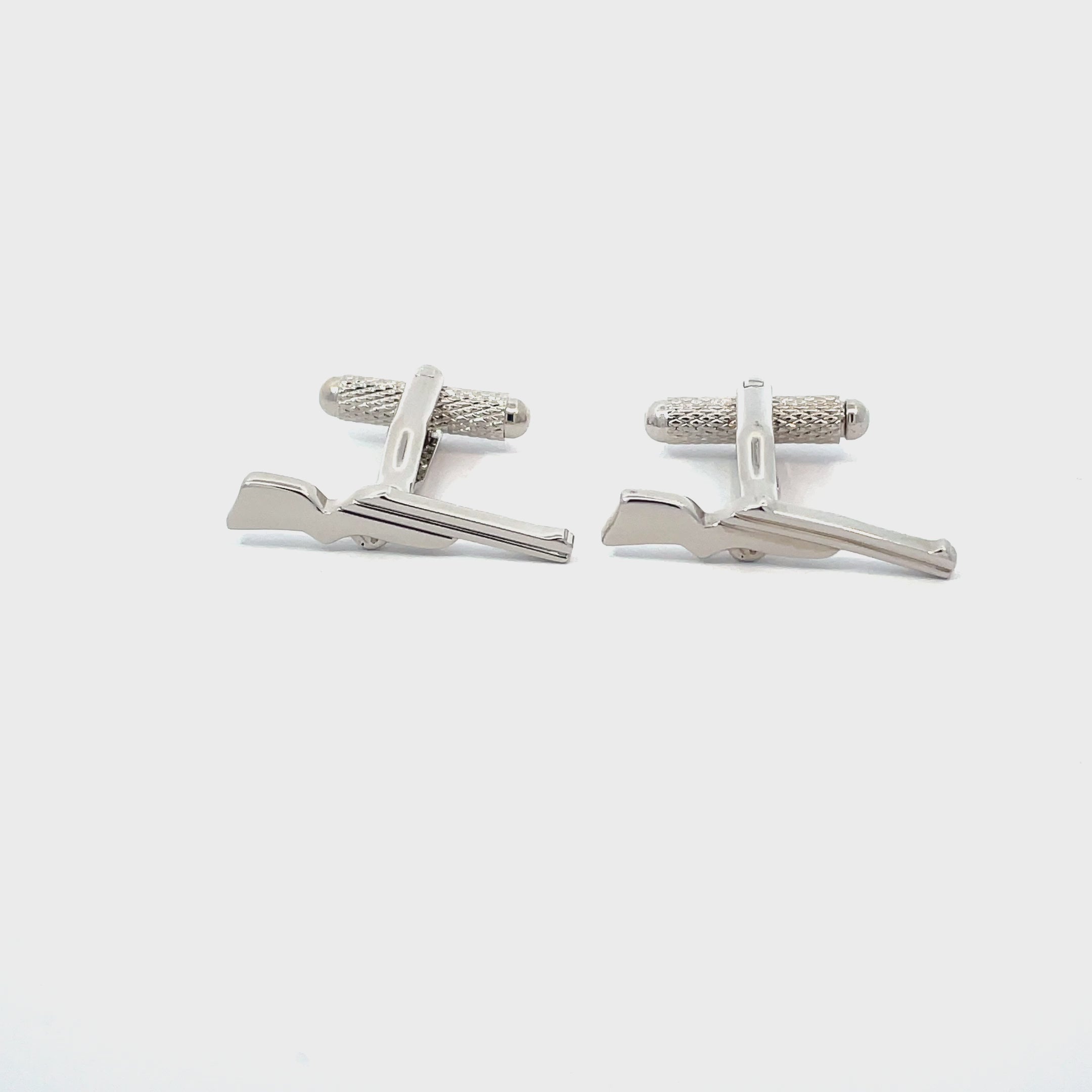 Aiming for distinctive style? These sleek silver-tone rifle cufflinks hit the mark. Crafted with clean lines and a polished finish, they offer a subtle nod to outdoor sport or sharp dressing. Finished in shiny rhodium plating.
