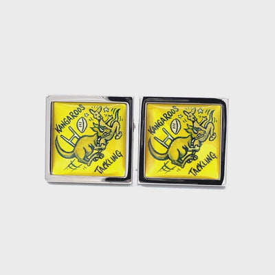 Bright, bold, and brilliantly Aussie! These vivid yellow cufflinks feature a cheeky kangaroo mid-tackle with a rugby ball flying and chaos ensuing. A must-have for rugby fans, wildlife lovers, or anyone with a wild sense of humour. Guaranteed to score laughs and compliments! Finished in enamel and shiny rhodium plating.