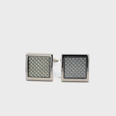 Elevate your style with these sleek square cufflinks, featuring a modern carbon fibre inlay set in shiny rhodium plated-brass. Perfect for adding a touch of sophistication to any formal or business outfit.
